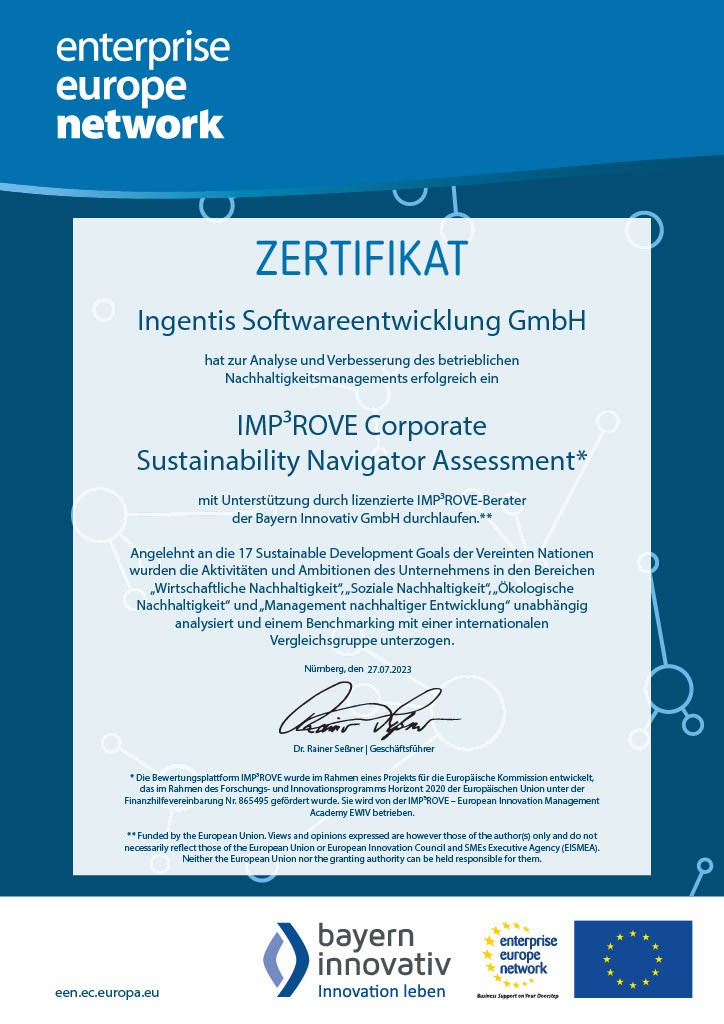The first milestone in Ingentis’ collaboration with bayern innovativ was participating in the “IMP3ROVE Corporate Sustainability Navigator Assessment” in which Ingentis’ ambitions and activities regarding economic, social, and ecological stability, as well as its management of sustainable development were independently analyzed and benchmarked against international peers. The assessment is based on the United Nations’ 17 Sustainable Development Goals (SDGs).