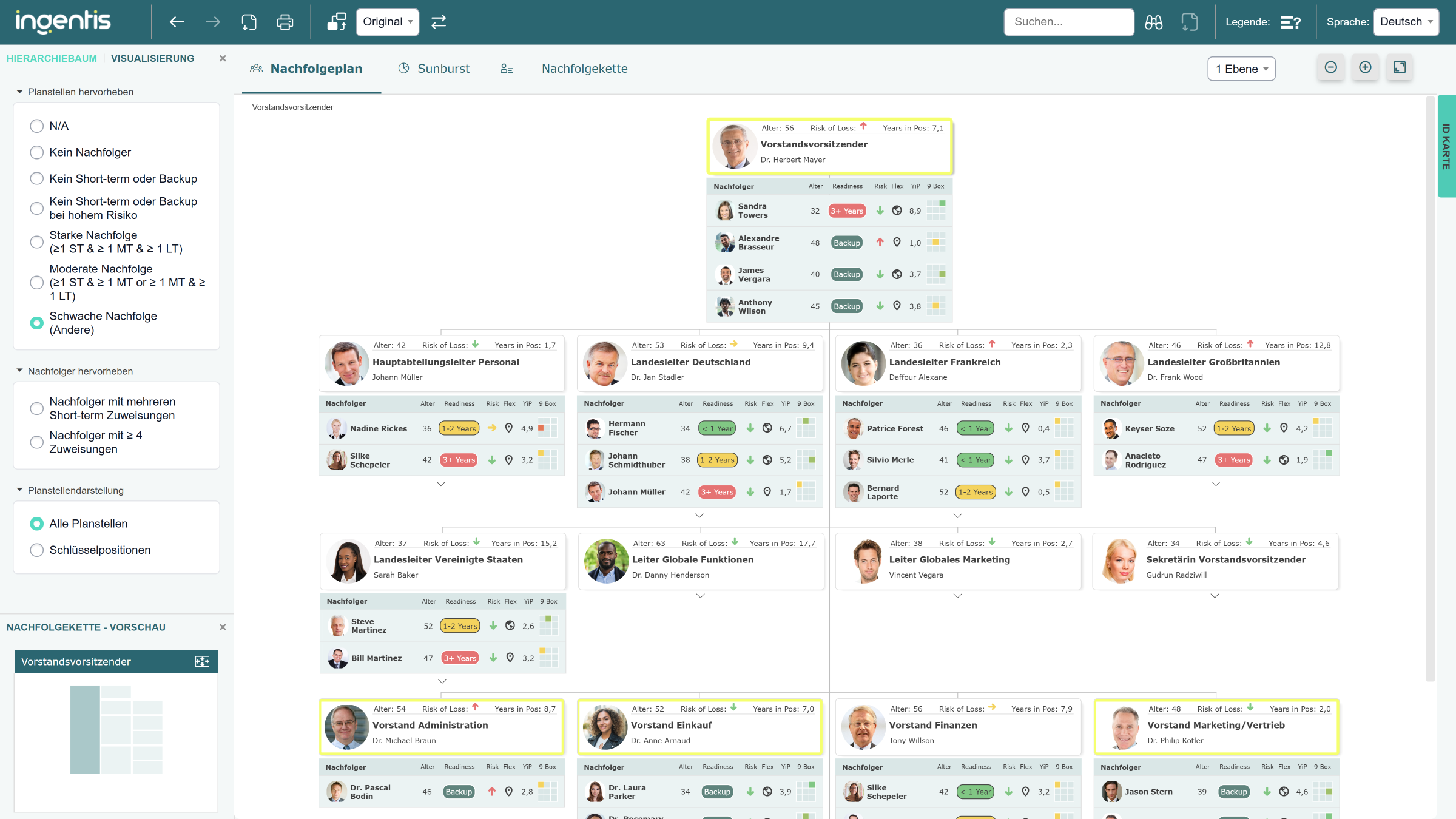 Whether it’s retirements, sudden departures, or long-term development strategies: The Ingentis org.manager Succession Planning Extension enables seamless transitions and strengthens organizational stability in the long run.